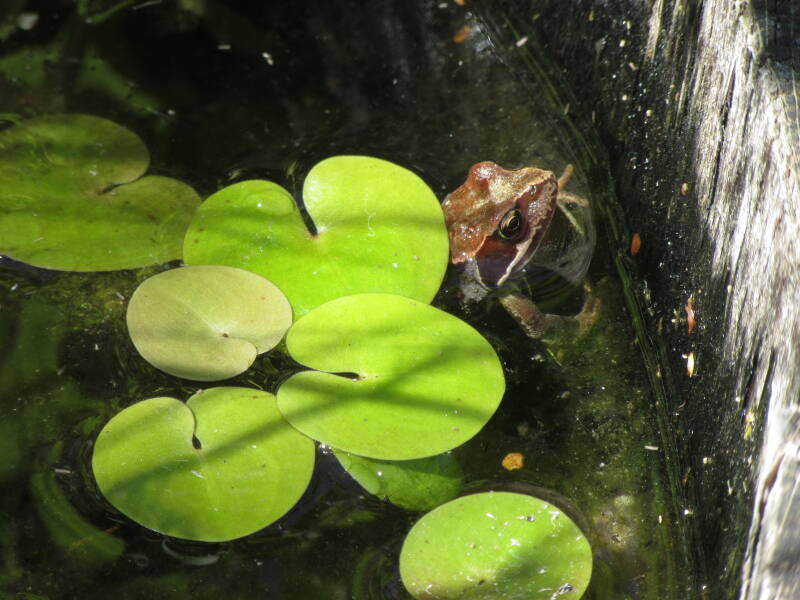 We're pleased that a frog has turned up in our barrel pond although how they get in and out is a mystery.
