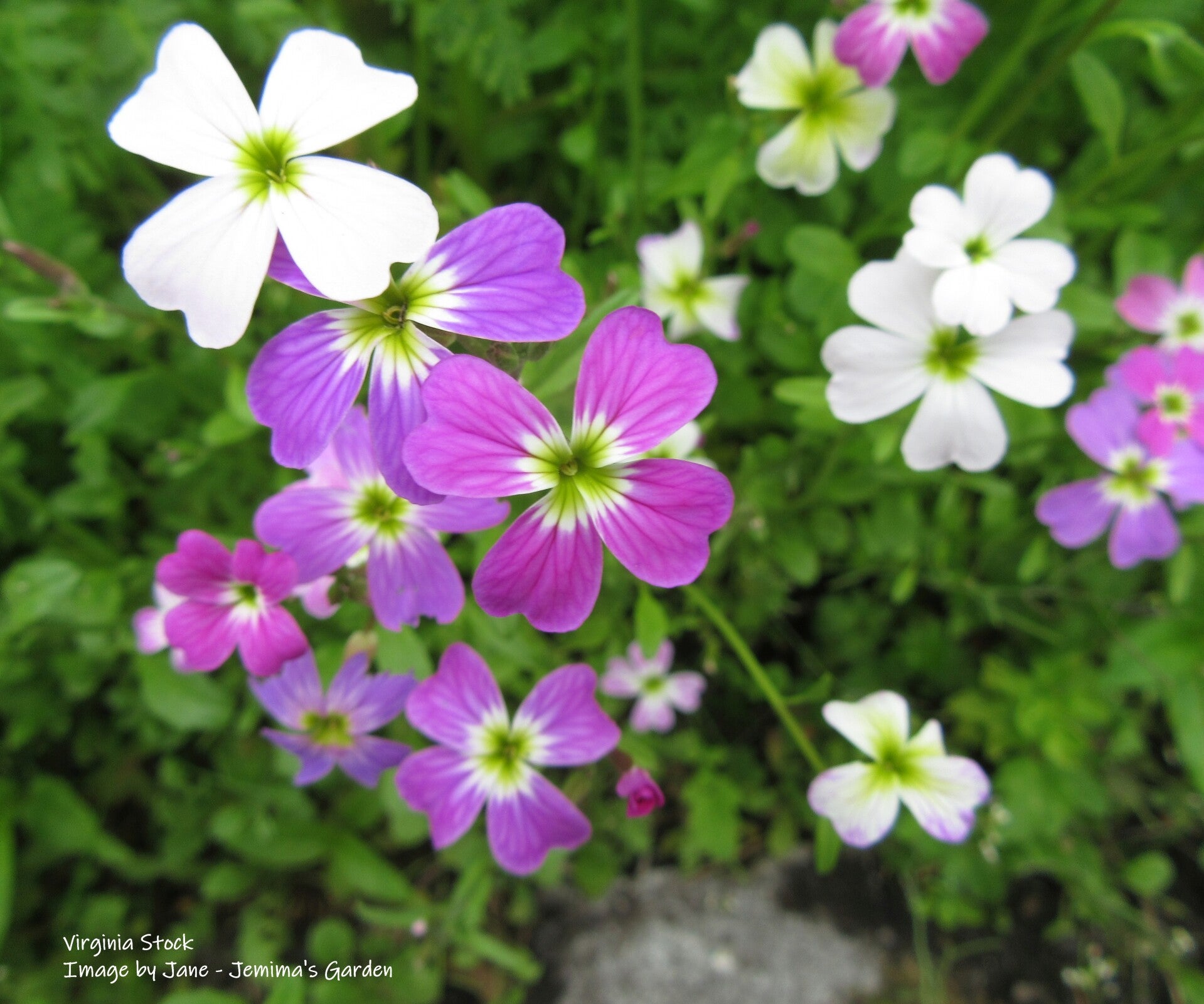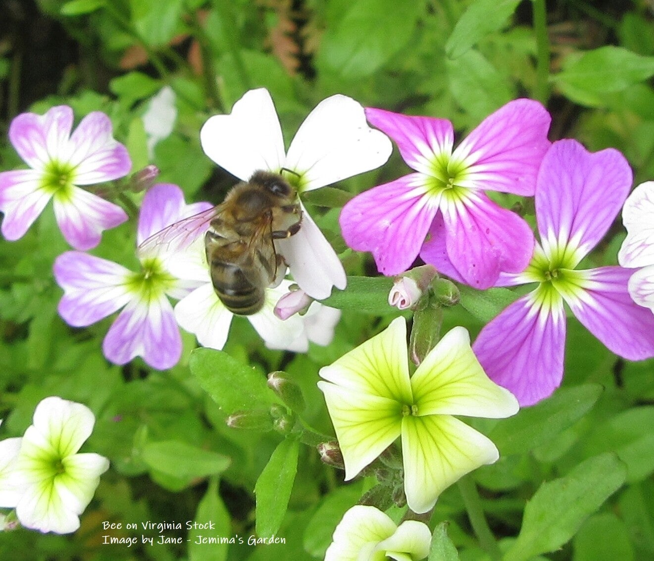 Grey-green leaves and numerous small, scented, pink, mauve, white and purple flowers with a green marked centre which are very popular with various pollinators.