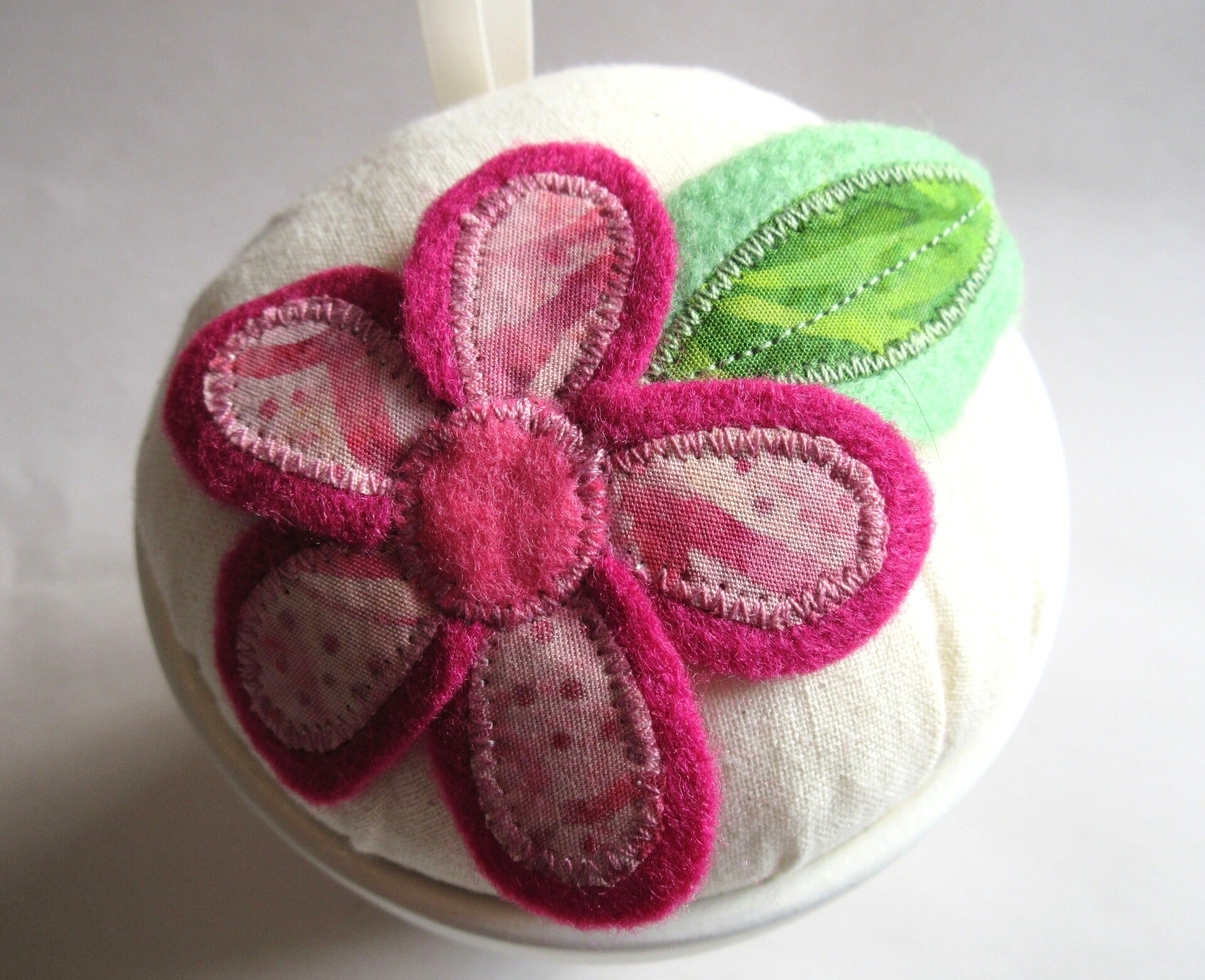 It's decorated with a handmade flower and leaf I've made using felt and cotton batik fabric.