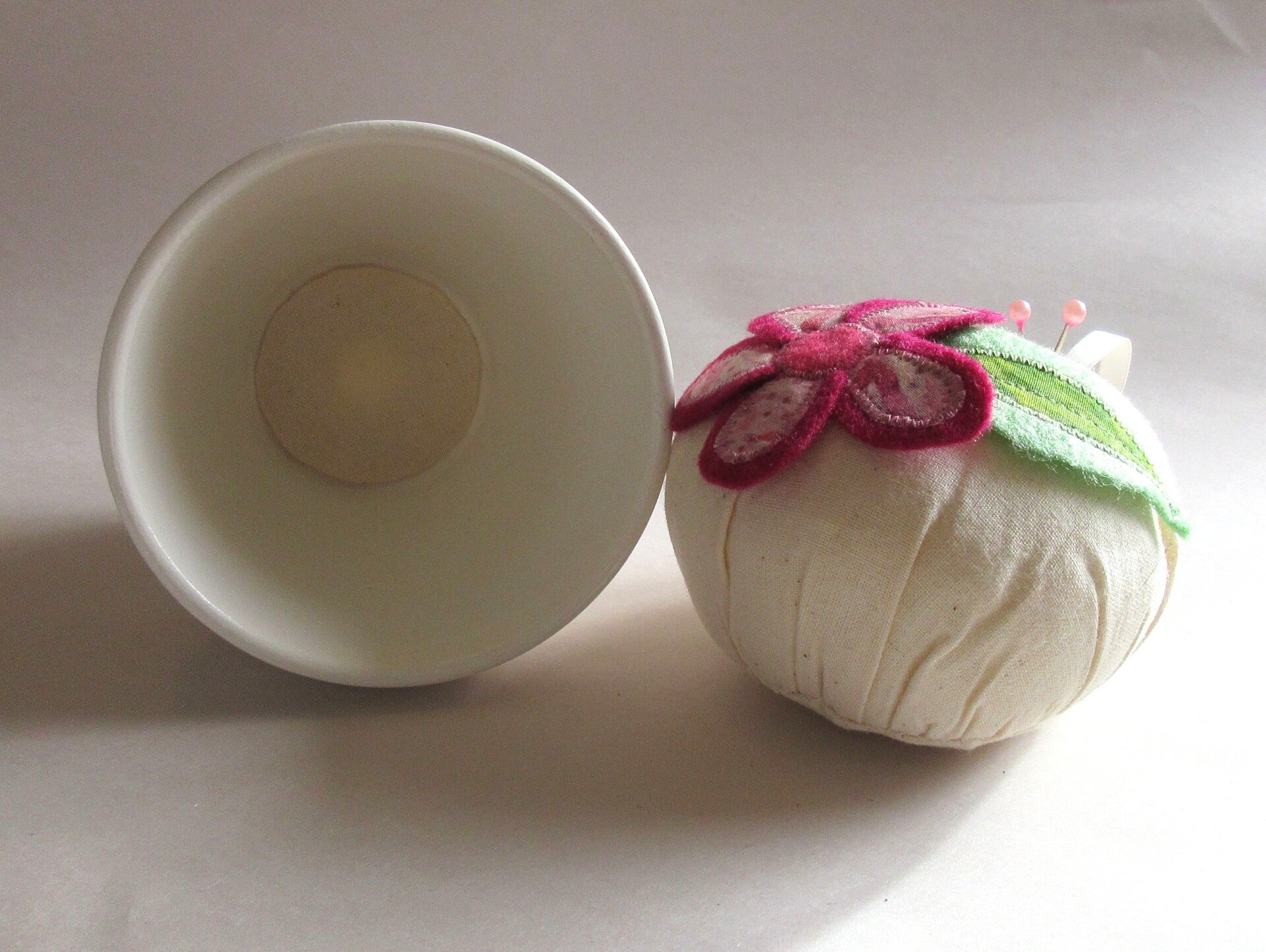 This pincushion is obviously useful for pins, but the top also lifts off to provide storage for a thimble or a few buttons.