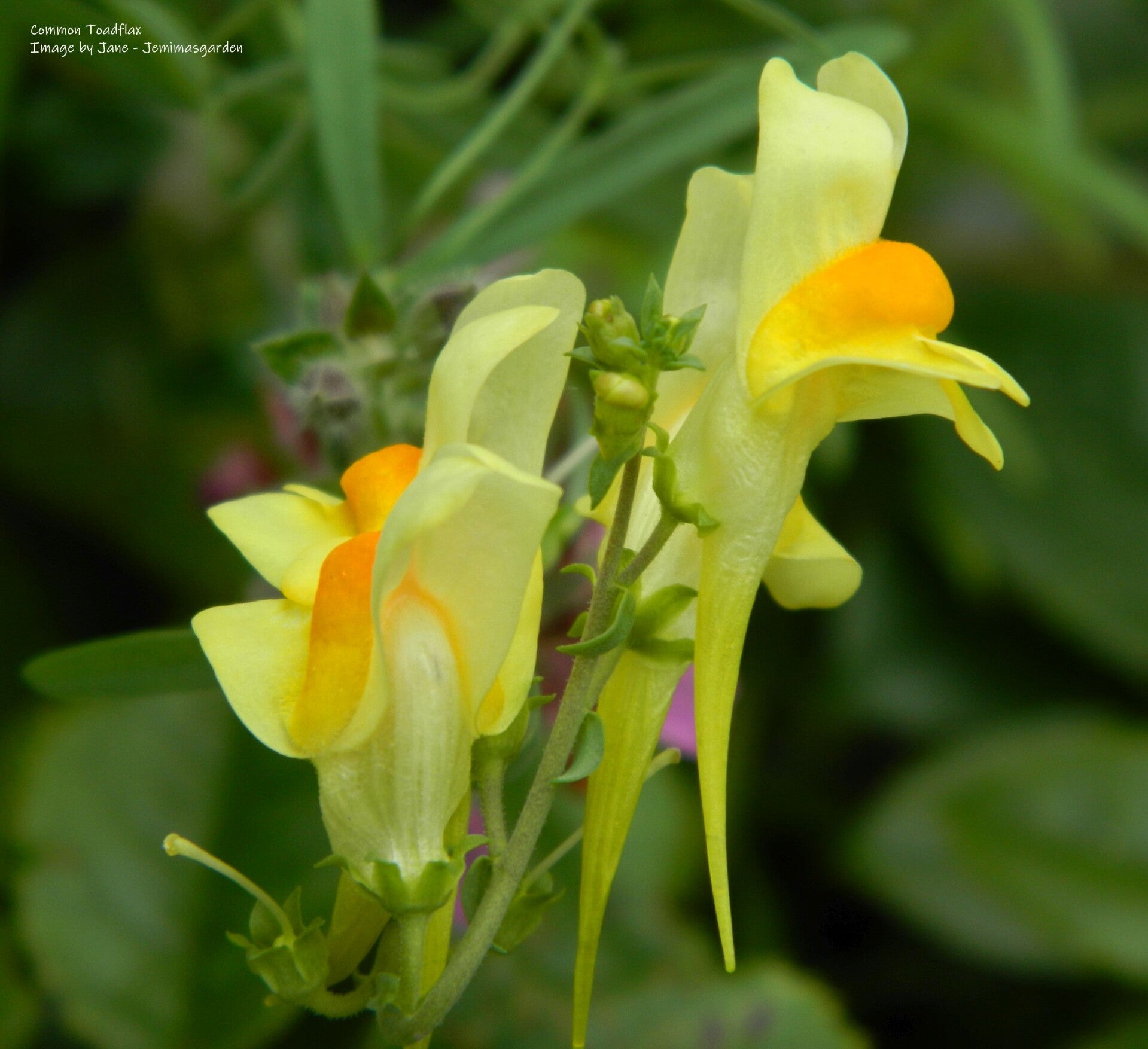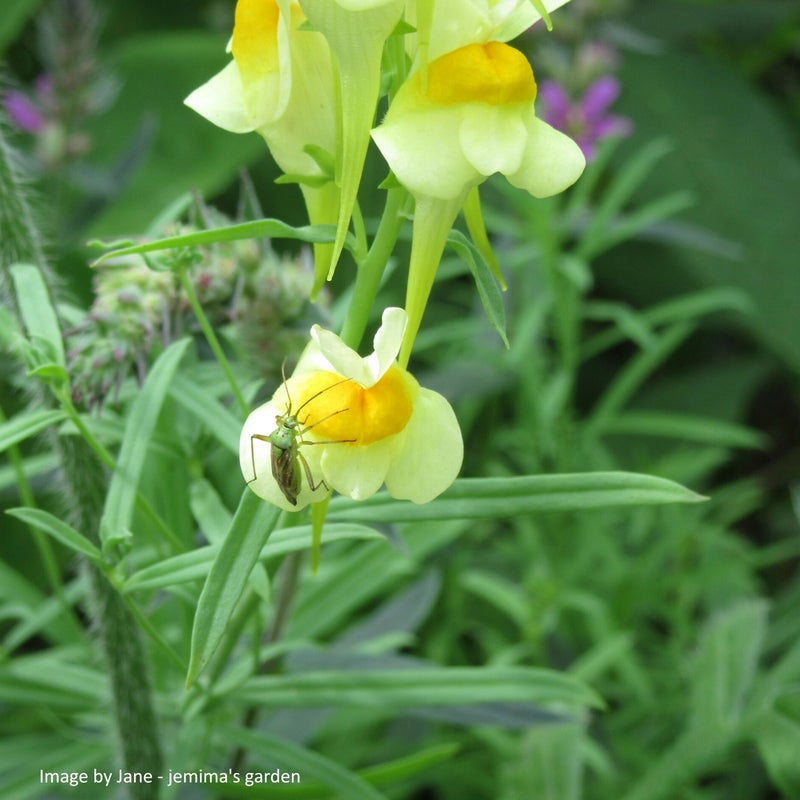 Toadflax has dense spikes of yellow flowers similar to small snapdragons. These are on upright, branched stems that grow from long creeping roots. The pale green pointed leaves are arranged in a spiral around the lower stem.