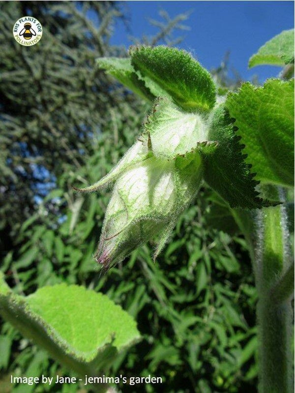 A beautiful, tall plant with strongly scented large wrinkly leaves and very pretty pale pink flowers and mauve bracts.