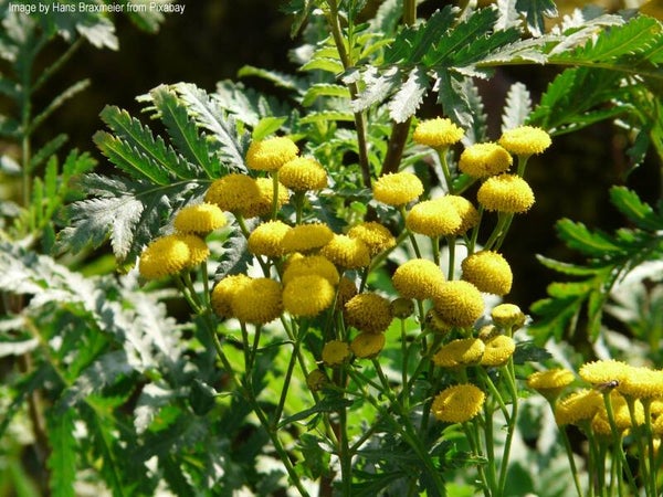 Also known as Buttonweed, Hind-heal and Bitter Buttons, Tansy has deeply-divided, aromatic leaves and clusters of golden button flowers through summer into autumn.